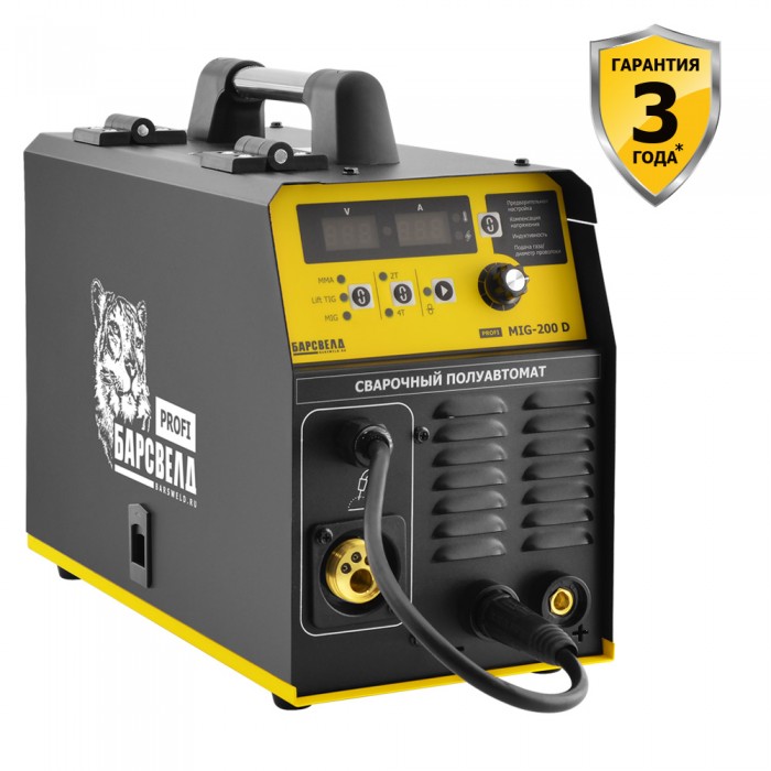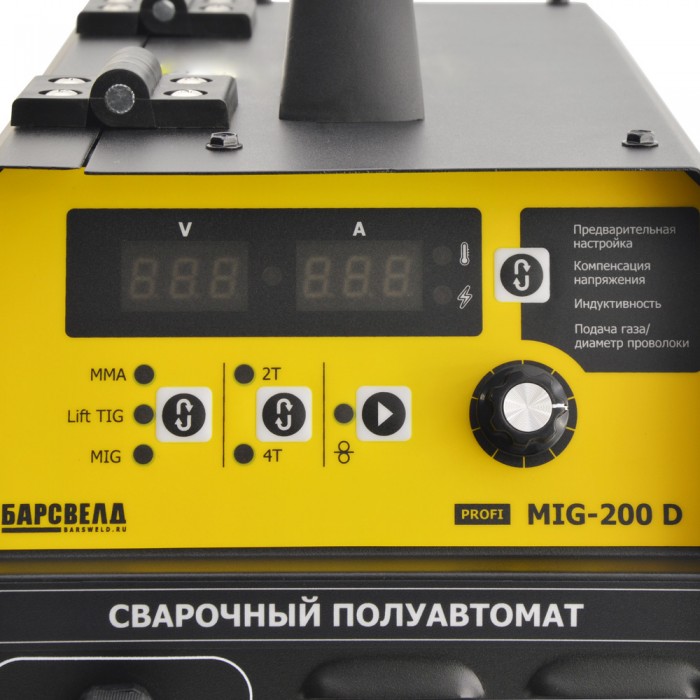 Сварочный полуавтомат БАРСВЕЛД Profi MIG 200 D – это профессиональный аппарат для сварки металлической проволокой в среде защитного газа на основе IGBT транзисторов. Мощный и универсальный аппарат, способный работать в трех режимах сварки: • MIG/MAG • MMA • Lift TIG (Lift – способ поджига дуги, основанный на плавном нарастании сварочного тока в момент зажигания дуги) Внешний вид: