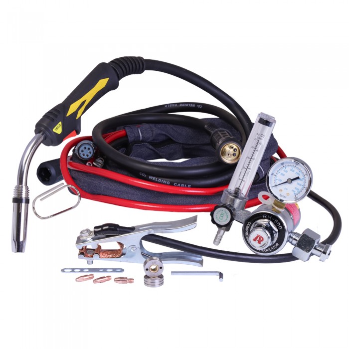 Комплетация: - сетевой кабель (2 м) - кабель с клеммой заземления (3 м) - соединитель кабельных разъемов (2 шт) - сварочная горелка MIG с кабелем (2,5 м) - быстроразъмное соединение для смены полярности (1 шт) - регулятор с подогревом (1 шт) - рукав воздушный (3 м) - разъем для крепления кабеля управления (1 шт)