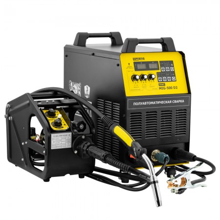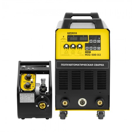 БАРСВЕЛД START MIG-500 D2 – абсолютно новая модель в линейке сварочных полуавтоматов БАРСВЕЛД, с помощью которой можно быстро решить множество сварочных задач. Использование современных компонентов и технологий, таких как IGBT-модули, системы широтно-импульсной модуляции и выпрямительно-волновой фильтрации позволили получить на выходе постоянный сварочный ток силой 500 А, используя для подключения промышленную сеть 380 В. Это дало возможность выполнять сварку изделий из черных и цветных металлов покрытым электродом диаметром от 1,6 до 6 мм в режиме MMA и электродной проволокой диаметром от 0,8 до 1,6 мм в режиме MIG/MAG. Сварка различных типов металла в нескольких режимах и высокий сварочный ток в сочетании с хорошим для своего класса периодом нагрузки 60% позволила модели БАРСВЕЛД START MIG-500 D2 стать основным рабочим инструментом в условиях массового производства, обеспечивая сварку большого количества деталей практически без перерыва. БАРСВЕЛД START MIG-500 D2 отличается: - широкой сферой применения; - стабильной работой даже при падении напряжения до 185 В; - максимальным значением силы тока 500 А; - возможностью сварки тонких деталей без деформаций или прожогов на поверхности; - 3-х летним сроком гарантии. В аппарате реализована синергетическая система управления, которая полностью оптимизирует циклограмму сварки в зависимости от выбранных начальных параметров. Кроме того, в аппарате предусмотрена возможность ручной настройки напряжения и индуктивности дуги, нарастания, спада и рабочей силы сварочного тока, а также времени начальной и окончательной продувки газом сварочной ванны. Продуманная панель управления позволяет настроить все эти параметры буквально в одно касание и контролировать их значение при помощи двух ярких дисплеев. Особо стоит отметить возможность настройки жесткости дуги, которая оптимизирует капельный перенос металла и снижает тепловложение, благодаря чему даже начинающий сварщик может работать с тонкими деталями, не оставляя прожогов и не деформируя их. Еще одной особенностью БАРСВЕЛД START MIG-500 D2 является отдельный механизм подачи проволоки, в который можно установить стандартные катушки весом до 15 кг и работать на большом удалении от источника тока. Открытое исполнение облегчает замену катушек и обеспечивает постоянный контроль за остатками проволоки. Также, для облегчения полуавтоматической сварки, производитель предусмотрел возможность быстрой смены режимов работы горелки 2Т/4Т, с которыми очень удобно выполнять длинные и короткие сварочные швы. БАРСВЕЛД START MIG-500 D2 – это не просто многофункциональный сварочный полуавтомат, это удобство, надежность и качество проверенное временем и подтверждающееся 3-х летней гарантией производителя.