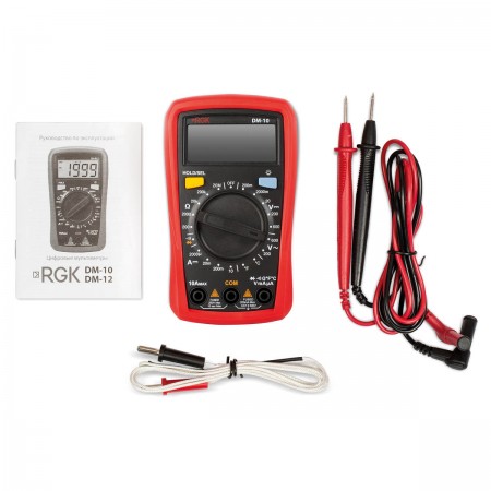 Мультиметр цифровой RGK DM-10 , Кабель измерительный с пробниками - 2 шт., Батарея питания ААА - 2 шт., Термопара типа "К" (для модели RGK DM-10 ), Руководство по эксплуатации