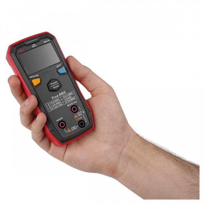 Благодаря датчику, который размещен в верхней части корпуса, мультиметр RGK DM-15 может определять наличие напряжения в розетках и проводах бесконтактным способом. О результатах оповещает наглядная светодиодная индикация. Режим LIVE (искатель фазы) используется с щупами и позволяет быстро отличить нулевой проводник от фазного.