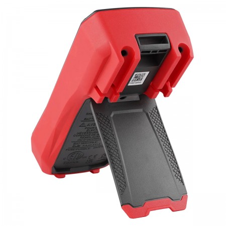 На задней поверхности устройства расположены петля для подвешивания и откидная подставка, которые позволяют установить измеритель так, чтобы специалисту было максимально удобно считывать показания, а руки были свободны для работы с щупами.