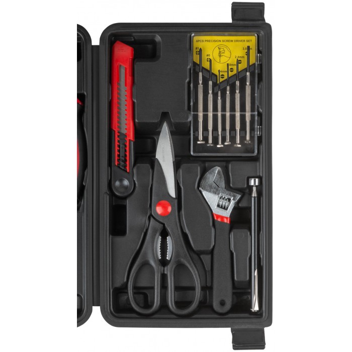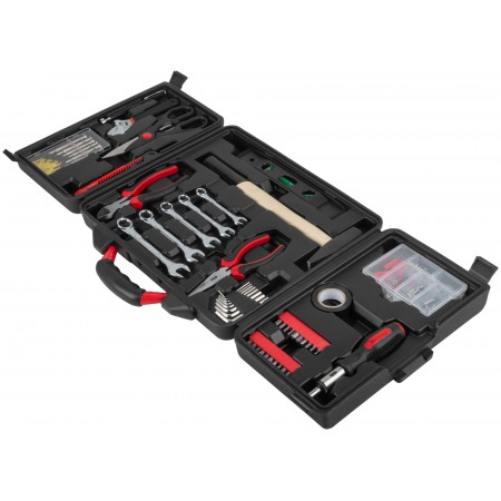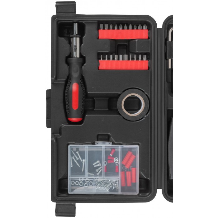 В наборе: тонконосы L=160 мм (1 шт.); бокорезы L=160 мм (1 шт.); ключ разводной L=150 мм (1 шт.); ножницы технические L=200 мм (1 шт.); нож технический, лезвие 18 мм (1 шт.); уровень L=200 мм (1 шт.); отвертки для точных работ: SL: 1,4; 2,0; 2,4; 3 мм, PH0, PH1 (6 шт.); ключи «hex»: 1,5; 2,0; 2,5; 3,0; 4,0; 5,0; 5,5; 6,0 мм (8 шт.); ключи комбинированные: 10;12; 13; 14; 15 мм (5 шт.); 20 бит: SL5, SL6, PH0, PH1, PH2-2 pcs, PH3, PZ1, PZ2, PZ3, HEX2, HEX3, HEX4, HEX5, HEX6, HEX7, T10, T15, T20, T30; отвертка реверсивная (1 шт.); изолента ПВХ (1 шт.); молоток 300 гр. (1 шт.); набор крепежа (гвозди, саморезы, клеммы, кнопки) (91 шт.); магнит телескопический (1 шт.). Материал: термообработанная инструментальная сталь, биты и отвертки из хром-ванадиевой стали. Упаковка: пластиковый чемодан.