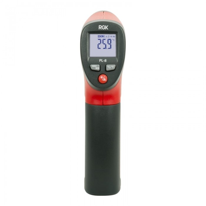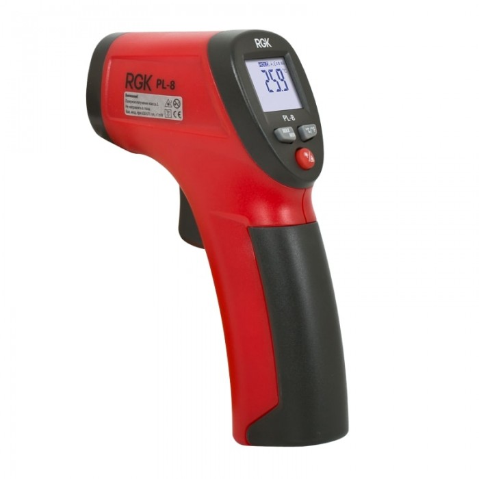 Пирометр RGK PL-8 – это универсальный инфракрасный термометр, позволяющий быстро и безопасно определить температуру любой поверхности. При небольшом весе и компактных габаритах этот инфракрасный пирометр оснащён всем необходимым набором функций и представляет собой самый доступный прибор этого типа на российском рынке. Благодаря своим характеристикам RGK PL-8 идеально подходит для регулярного контроля на производстве, в сфере ЖКХ и в быту, так как невысокая цена и интуитивная простота обращения делает этот пирометр доступным широкому кругу пользователей. Прибор выполнен в виде пистолетной рукояти с большой спусковой кнопкой, что обеспечивает удобство измерения, а инфракрасный метод измерения гарантирует безопасность пользователя даже при работе с сильно нагретой поверхностью или проводниками под током.