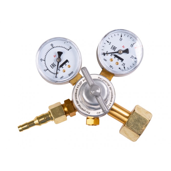Аргоновый регулятор расхода газа с манометром и манометром-расходомером КЕДР АР-40 предназначен для понижения давления газа, поступающего из баллона, и автоматического поддержания постоянным заданного рабочего давления при сварке в среде защитных газов. Производит тонкую настройку рабочего давления. Корпус регулятора изготовлен из алюминия. Благодаря этому регулятор обладает компактной формой и облегченной конструкцией. Аргоновый регулятор КЕДР АР-40 подойдет для мобильных и стационарных сварочных постов и для эксплуатации на небольших предприятиях или частных мастерских.