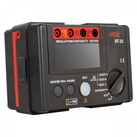 Электронный мегаомметр RGK RT-25 защищен от скачков напряжения по классу CAT III 600В и может применяться для замеров на коммутационном оборудовании, распределительных щитах, фидерах и трехфазных сетях.