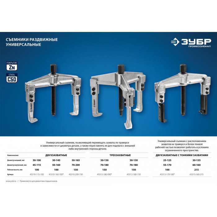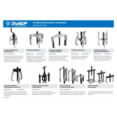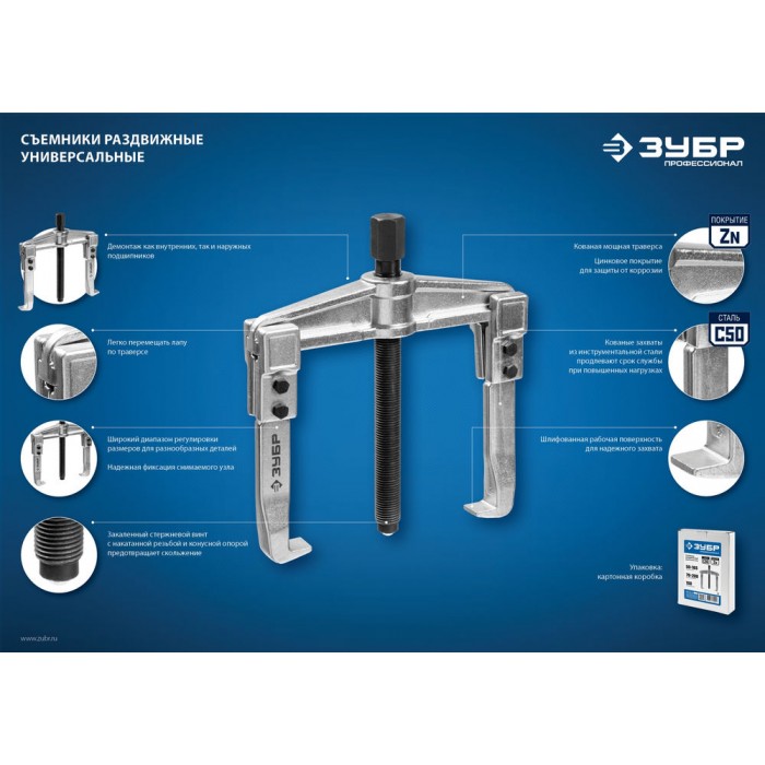 Захваты съемника выкованы из качественной инструментальной стали, что обеспечивает долгий срок службы при работе с высокими нагрузками. Позволяет работать с широким рядом узлов. Уменьшенные по толщине захваты дают возможность работать в условиях ограниченного пространства.